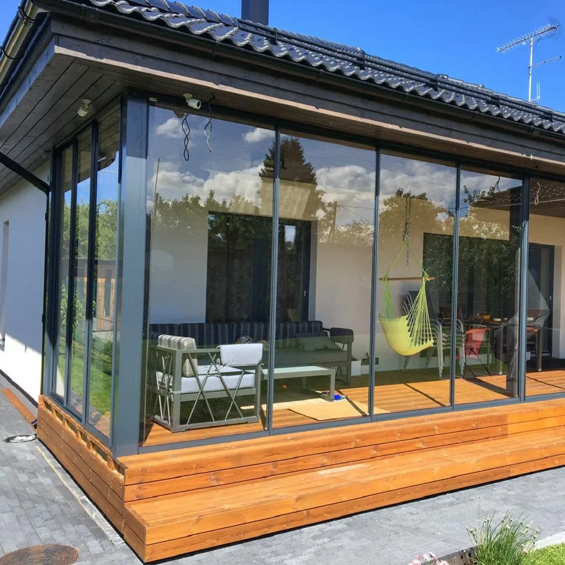 Преимущества: Максимальная теплоизоляция и герметичность. Значительно продлевает сезон комфортного использования, защищает от холода, ветра, осадков и пыли. Создает ощущение дополнительной комнаты.